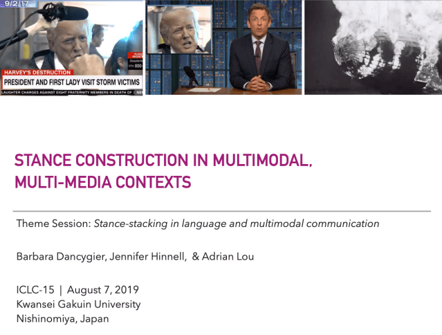 Together we’re exploring the expression and negation of stance and beliefs across a variety of genres. For a brief look at the type of work, here’s our presentation at ICLC15 in Nishinomiya, Japan.