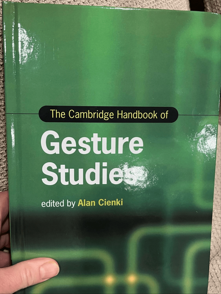 I got my contributor copy of this in the mail today. A total pleasure and honour to have a chapter on “Iconicity, Schematicity and Representation in Gesture” in the new Cambridge Handbook of Gesture Studies, cowritten with my colleague Dr. Irene Mittelberg. Kudos to editor Dr. Alan Cienki for pulling together such a treatise on the current state of the field. Download a copy here.