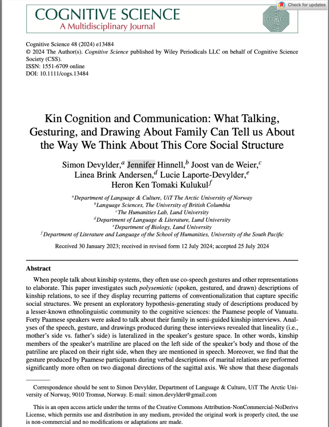 Teamwork makes the dreamwork! Today I am celebrating a publication in the journal Cognitive Science with a wonderful international team of gesture researchers, data scientists and semioticians. In this research we explored how the Paamese people in Vanuatu speak, draw, and gesture about their family structures, and discuss how this line of research could shift how we study and consider social structures and cognition.